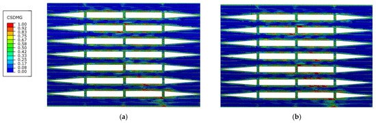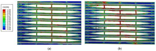 , , and represent the work carried out by traction forces along with their corresponding relative displacements. , , and denote the critical fracture energies required to induce failure in the normal and two tangential directions, respectively. Upon damage initiation, the cohesive elements follow the constitutive relationship defined by Equation (10), as follows: