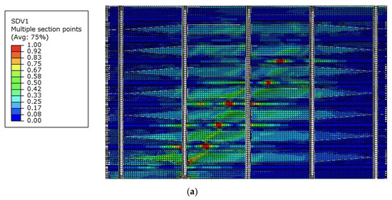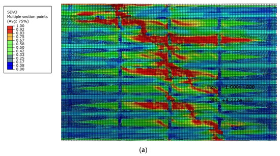 The damage variables d1 and d2 are employed to characterize the degradation of the fiber and matrix, respectively. A value of 0 indicates undamaged material, while a value of 0.98 represents fully damaged material.