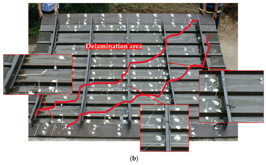 After the fuselage experienced secondary buckling and interfacial debonding, skin wrinkling and structural failure quickly ensued. The failure mode of the test specimen under compressive loads exhibited wrinkling on the outer skin surface, delamination of the skin from the stiffeners at the failure section, and compressive failure of the stiffeners, as shown in Figure 14.