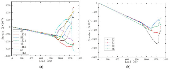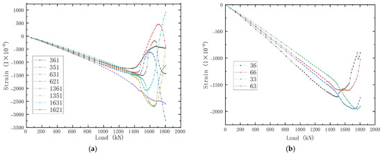 Figure 27a displays strain readings from four additional regions of the skin. When the load reached 1546.43 kN, a second buckling point appeared in the strain curves of the panel skin. As shown in Figure 27b, the skin’s buckling triggered a progressive load redistribution, with the stiffeners assuming an increasing role in carrying the compressive load, as evidenced by the pronounced tangent in their strain curves and response curves. Following the onset of the skin’s second buckling, as loading to 1613.66 kN, the stiffeners exhibited buckling, which is 4.35% higher than the second buckling load of the skin. This sequential failure mechanism indicates that the stiffener’s loss of stability disrupted the original load-sharing equilibrium, inducing the onset of global structural instability, which triggered a rapid degradation in the structural load-bearing capacity.