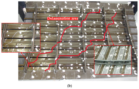 Figure 28 presents the progressive debonding between the stiffeners and skin. When the load reached 1629.73 kN, interfacial debonding initiates which is dominated by shear stress at the skin−stiffener interface, as shown in Figure 28a. The final debonding area is shown in Figure 28b.