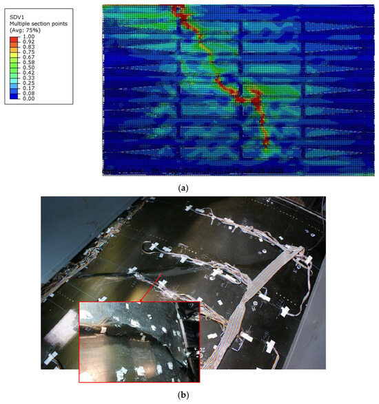 Comparison of failure modes in the experiment and finite element analysis under combined load case B. (a) Fiber compressive failure (corresponding to state variable SDV1) in finite element analysis. (b) Failure mode in the experiment.