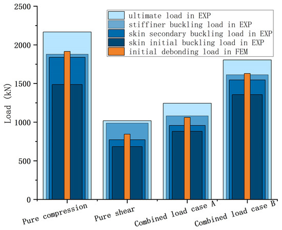 Figure 30 provides a summary of the curved fuselage panels’ structural performance across four loading conditions. The figure contains initial buckling and secondary buckling loads of skin, buckling loads of stiffeners, ultimate loads of specimens, and initial debonding loads in FEM. Through integrated finite element analysis and experimental investigations, the load transfer mechanisms of curved panels were examined.