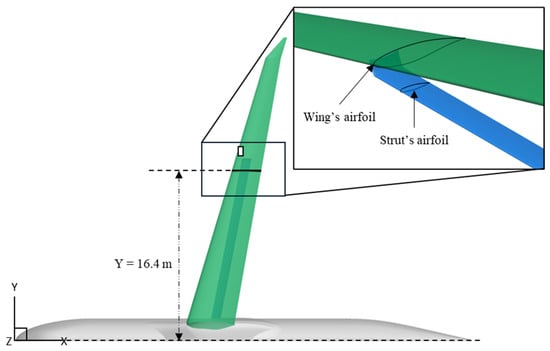 The optimization process utilized a two-dimensional CFD numerical simulation approach applied to a 2D section extracted from the PADRI configuration at Y = 16.4 m, as shown in Figure 3. This focused on optimizing the strut’s airfoil geometry in the region where shockwave interactions between the strut and the wing are most intense while maintaining the computational cost for the evaluation of the objective function at minimum.