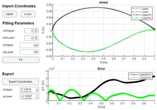 Figure 4 presents the graphical interface of the MATLAB code used for the fitting process. The code takes as input the coordinates of the reference airfoil, the number of CST parameters for both the upper and lower surfaces, and the number of points. It then displays the fitted airfoil alongside the reference airfoil, and beneath the plot, it shows the absolute error between the two airfoils for both the upper and lower surfaces.