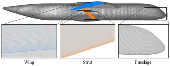 For the parametric study, the grid generation for the entire configuration used ANSA CAE. The surface mesh illustrated in Figure 5 was divided into four primary regions: fuselage, wing, strut, and curved transition zone. The element type was set to quadrilateral for all regions. The wing and fuselage were meshed with a maximum element size of 250 mm and a growth ratio of 1.2. The strut and curved transition zone shared a growth ratio of 1.15, with maximum element sizes of 50 mm and 10 mm, respectively. A consistent minimum element size of 1 mm was maintained across all regions. Anisotropic meshing features were incorporated for the trailing and leading edges of the wing and strut, supported by guiding curves to ensure anisotropy on their upper and lower surfaces. These adjustments optimized the grid size while maintaining high mesh quality and geometric accuracy.