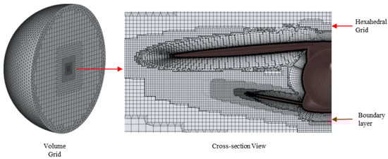 For the volume grid, the boundary layer region was discretized using prismatic, hexahedral-dominant layers generated with an inflation algorithm. The first cell size was set to 0.008 mm, with a growth ratio of 1.2, and a total of 51 layers were defined to accurately capture boundary layer flow region. For the remaining volume mesh, the Hexa Interior option was utilized, incorporating four buffer zones to ensure smooth transitions between the boundary layer and the core mesh. The final volume mesh, including the hexahedral grid and boundary layer region, is illustrated in Figure 6.