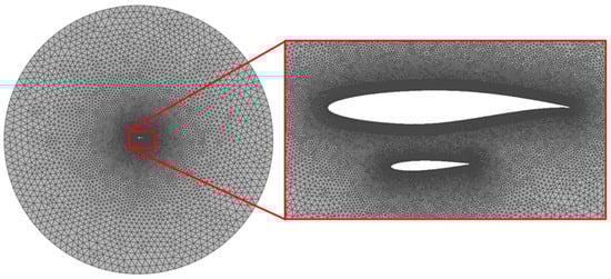 For the optimization process, ANSYS 2021 Meshing was selected as the optimal tool to streamline the coupling of geometry, grid generation, and numerical simulation. Due to the identical operating conditions, the first cell height and the number of layers in the inflation region were kept consistent with the 3D configuration. However, the growth ratio was adjusted: 1.2 for the wing and 1.1 for the strut due to the chord length differences. The dominant cell type for the mesh was set to triangular. For the strut and wing surfaces, a grid size of 3.5 mm was applied, with curvature refinement enabled to reduce the element size to 1.5 mm in regions requiring higher grid resolution. For the trailing edge of the wing and strut, a size of 5 divisions was selected, as the trailing edge thickness remained unchanged throughout the optimization process. The global growth size for the entire domain was set to 1.05, ensuring accurate capture of shockwave interactions, with a maximum cell size of 6 m. The resulting mesh in the domain is presented in Figure 7.