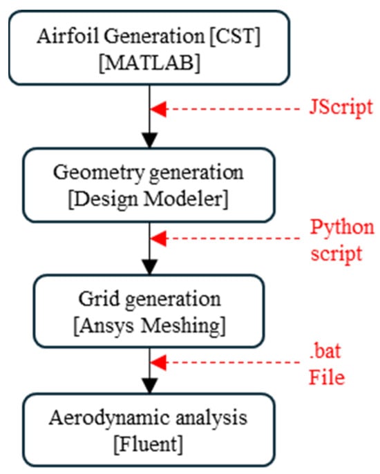 The optimization variables are the CST parameters for the upper and lower surfaces of the strut’s airfoil, with three parameters assigned to each surface, as well as the local incidence of the strut’s airfoil. This results in a total of seven design variables defined for the optimization problem. The logical framework for evaluating the objective function is presented in Figure 8. A MATLAB script was used to generate the strut’s airfoil coordinates based on the CST parametrization method. These coordinates were exported to ANSYS Design Modeler, where a JScript was employed to create the computational domain. Subsequently, the domain was meshed as described in Section B and exported to ANSYS Fluent for aerodynamic analysis, as outlined in Section C. The lift and drag coefficients were extracted from Fluent and integrated into the optimization loop to guide subsequent iterations.