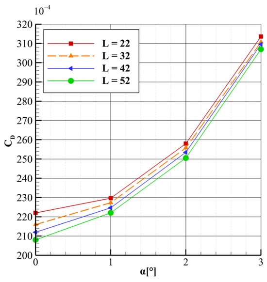 The first parameter analyzed is the length parameter L. The variations in lift and drag coefficients are presented in Figure 9 and Figure 10. A quasi-linear relationship is observed between the drag coefficient and the length parameter, with an increase in the latter leading to a reduction in drag. Furthermore, it was observed that the sensitivity of this parameter diminishes as the angle of attack increases. For α = 1°, the reference flow configuration, the drag coefficient decreases from 230 drag counts to 221, indicating a reduction of approximately 4%. Looking at the variation of the drag coefficient with respect to the angle of attack reveals that at α = 0°, the drag reduction is 6%, while at α = 3°, the reduction decreases to 2.2%. In the case of the lift coefficient, the length parameter exhibits minimal influence, with only marginal changes observed at α = 0° and α = 3°. This behavior can be attributed to the fact that variations in the length parameter primarily affect the intensity of shockwave interactions, which have a more significant impact on the overall drag than on lift. However, a subtle change in lift coefficient behavior can be observed at 0° and 3° angles of attack. As the length parameter increases, there is a slight but noticeable rise in lift coefficient. This trend may be attributed to stronger shockwave interactions at 0°, where the shock intensity is highest. These interactions alter the pressure coefficient distribution on the wing and strut, leading to a reduction in lift. At 3°, a similar but much less pronounced effect is observed, with the difference in lift coefficient remaining under 1%. This reduced influence is consistent with the overall trend of diminishing sensitivity to the length parameter as the angle of attack increases.