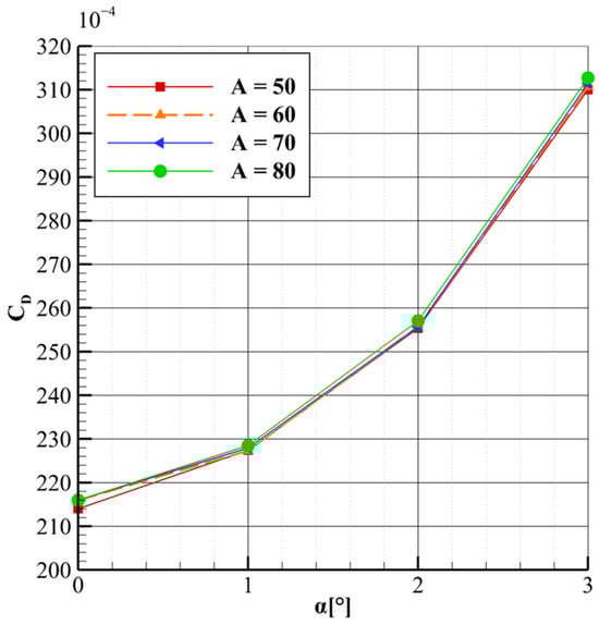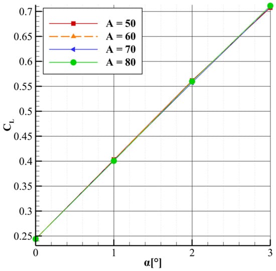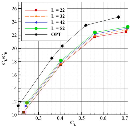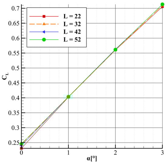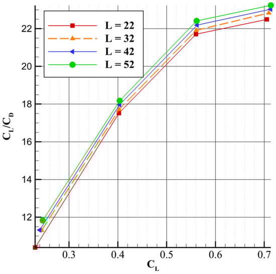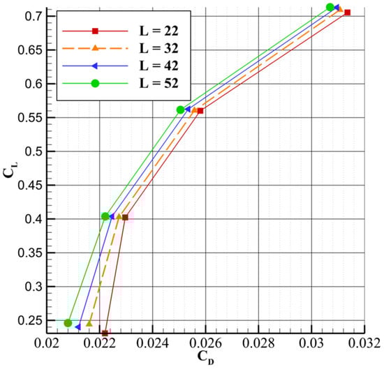 Figure 11 shows that as the length parameter increases, the lift-to-drag ratio improves, with the curves maintaining a quasi-parallel trend. In addition, the sensitivity of the lift-to-drag ratio to the length parameter increases slightly with higher lift coefficients. For instance, at lower CL values, the variation in CL/CD due to changes in length is small, whereas at higher CL values, the sensitivity becomes more pronounced. This suggests that the aerodynamic benefits of increasing the strut length become more significant at higher lift coefficients. A similar quasi-parallel trend is seen in Figure 12, which plots CL versus CD. As with the drag versus angle of attack curve, the influence of the length parameter on lift becomes less pronounced at higher lift coefficients, though the reduction in lift is less substantial than the corresponding decrease in drag.