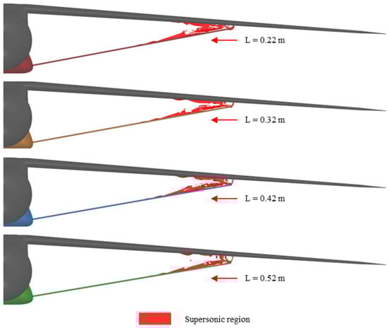 Figure 13 illustrates the variation in the supersonic region with length parameter L, while maintaining a fixed twist angle θ = 70° at α = 1°. An iso-surface value of 1.1 was chosen for the visualization. As can be seen, increasing L results in a reduction in the dimensions of the supersonic region. This aligns with the quantitative results presented earlier, which show a reduction in the drag coefficient, attributed to the minimization of the shockwave-induced drag. Notably, when L = 0.22 m, a shockwave forms on the lower surface of the strut elbow, but this region disappears as L increases. Furthermore, parameter L has a more significant influence on the lower surface of the wing, where the supersonic region diminishes with increasing L. This behavior can be explained by the larger gap between the wing and the strut, which reduces fluid acceleration. A similar effect is observed on the strut, where the location of the first appearance of the shockwave shifts further in the y-direction.