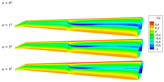 Figure 14 illustrates the variation in pressure coefficient distribution with respect to the angle of attack for the reference case. As the angle of attack increases, the spanwise extent of the shockwave appears to decrease. This behavior may be attributed to changes in the pressure distribution caused by altered flow conditions. At higher angles of attack, the pressure gradient along the flow direction on the lower surface of the wing becomes less steep, reducing both the strength and spanwise influence of the shockwave. This likely occurs because the flow acceleration on the inner surface of the wing begins to diminish, leading to an overall deceleration of the flow through the channel formed between the wing and strut.