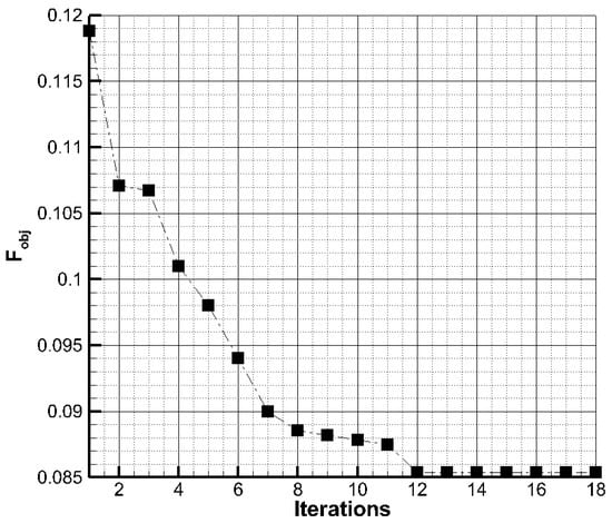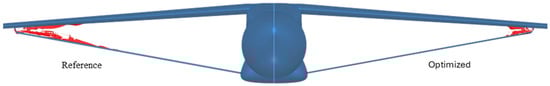 Figure 18 presents the convergence histogram of the optimization process. The drag coefficient, which was used as the objective function, was reduced by nearly 28% while reaching the minimum surface area constraint. Although the lift coefficient also decreased by 24%, the larger reduction in drag led to a 4.5% improvement in the lift-to-drag ratio. This outcome may result in a slight reduction in overall lift for the aircraft. The improvement is primarily attributed to the optimized local incidence angle of the strut, which helped reduce flow acceleration within the strut–wing channel. It is important to note that this optimization was performed in two dimensions, and therefore, three-dimensional effects such as spanwise flow and the strut elbow geometry were not accounted for. Thus, the fully optimized aircraft configuration, which incorporates the modified strut geometry, was analyzed and compared with the reference configuration. In the optimized configuration, the strut geometry was generated using the same airfoil and a constant local incidence along the entire span.