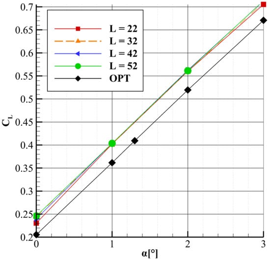 CL vs. α for the optimized configuration compared to the parametric study results.