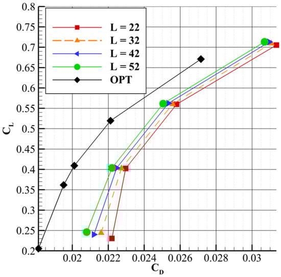 CL vs. CD for different lengths L at θ = 70°.
