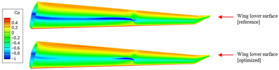 Pressure coefficient distribution on the lower surface of the wing for the optimized and reference geometries.