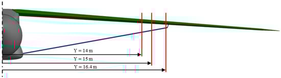 To further investigate these effects, three representative regions were selected, as shown in Figure 25, an approach similar to that adopted in [23], to analyze how the pressure coefficient distribution changes with respect to the spanwise position within the strut–wing gap. The selected regions are as follows: the first is the region where the 2D optimization was performed at Y = 16.4 m, the second is near the end of the supersonic region at Y = 15 m, and the last is located further away at Y = 14 m from the supersonic region but still within the aerodynamic interaction zone between the strut and wing.