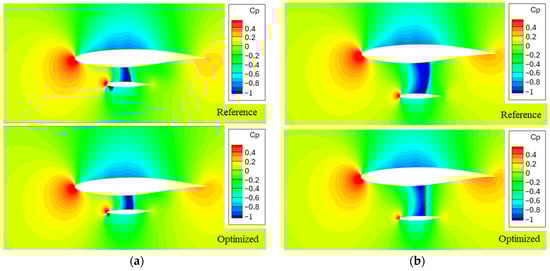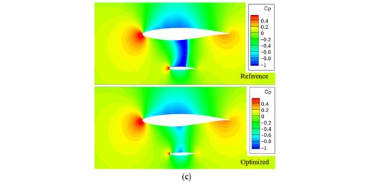 Figure 19 and Figure 20 show the lift and drag coefficients variation with angle of attack for the optimized configuration, compared to the results from the parametric study. As observed, the quasi-linear trend of the strut remains as in the parametric study, but the drag coefficient reduction is more pronounced. Particularly, for the reference flow conditions, the drag coefficient is reduced by 14%, as indicated by the orange dashed line representing the reference geometry. However, this drag reduction comes at the cost of a 10% decrease in the lift coefficient, due to the negative local incidence of the strut. To mitigate this trade-off, the angle of attack of the entire configuration was adjusted to match the lift coefficient of the reference geometry. The new angle of attack was determined to be α = 1.3°, resulting in an 11.5% reduction in drag compared to the reference geometry. This significant drag reduction demonstrates the utility of the insights gained from the parametric study, particularly regarding the importance of flow acceleration within the strut–wing gap, in suggesting the inclusion of the strut local incidence as an optimization variable. Furthermore, although the optimization was conducted in 2D, neglecting spanwise effects and the strut’s elbow geometry, the primary factor contributing to the drag reduction was found to be flow acceleration reduction.