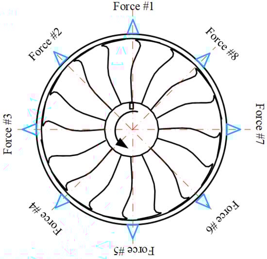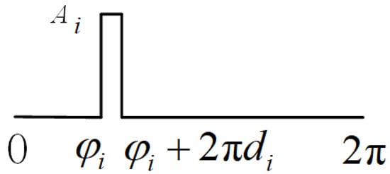 where is the number of excitation forces. is the amplitude of the i-th force. squarewave (ϕ, duty) is the square wave function which is used to simulate the force shown in Figure 3. The input variable is time series. is the duty cycle of the square wave function; in this paper, it can be set as . is the circumferential angle of the excitation force. In this paper, it is assumed that the first excitation, located at 0° and , is