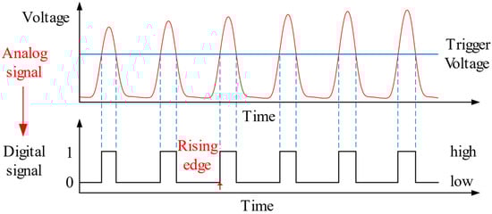 Figure 4 shows the trigger signal of the probe and the analog-to-digital conversion process of the test acquisition. The analog signal is the BTT arrival voltage signal collected by the fiber optic sensor-based acquisition system. To simulate the BTT sampling process, the following simulation program was constructed.