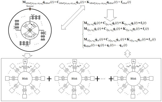 From Equation (39), the multimodal vibration displacement can actually be decomposed into a superposition of multiple SDoF vibrations (with corresponding natural frequencies, amplitudes, and phases) (Figure 5). Therefore, the simplest and most effective multimodal simulation only requires the construction of multiple SDoF blade models. Based on the dynamic equations shown in Equation (11), the vibration displacements of modes are obtained independently. And the superposition of each SDoF vibration displacement at the same moment can be equated to the multimodal vibration displacement. This solution allows the matrix equations of order (Equation (40)), which need to be solved for a MDoF model, to be solved for matrix equations of order (Equation (41)). This greatly reduces the modeling difficulty as well as the computational difficulty.