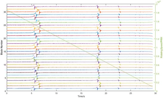 To obtain the response of the blade under the excitation forces, the differential equations of the dynamics shown in Equation (11) are solved using a differential equation solution method such as the Runge–Kutta method or Newmark-βmethod. The vibration displacement , vibration velocity , and vibration acceleration of the blades can be easily obtained based on this model. And velocity-based BTT (V-BTT) is also being taken as a new research direction [7,13,14,20], which is considered to be more favorable for obtaining high-precision blade vibration parameters.
