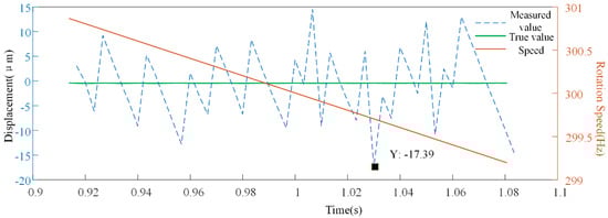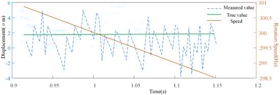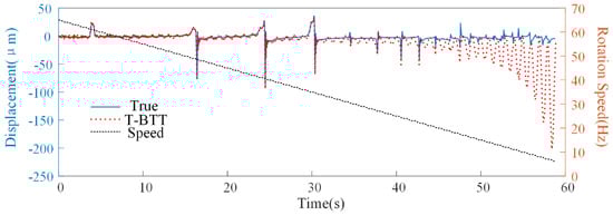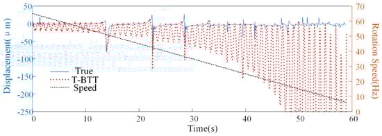 The comparison of the vibration displacements of blades No. 2 and No. 16 obtained by T-BTT method with the true values are shown in Figure 19 and Figure 20 below. The obtained vibration displacements are significantly different from the true values, and the lower the rotational speed, the greater the influence of rotational speed fluctuations, which includes the influence of sinusoidal fluctuations, as well as the deceleration processes. Therefore, in this case, the T-BTT cannot be used properly and the BTT method, which takes into account the influence of the rotational speed fluctuations, needs to be used.