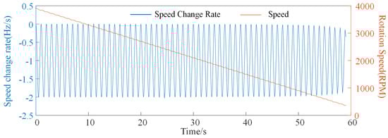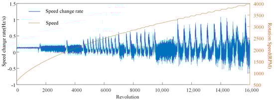 In one of the experiments, the rotational speed showed a significant periodic fluctuation. The rotational speed and the change rate of rotational speed calculated using SG-BTT are shown in Figure 28.
