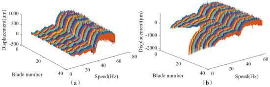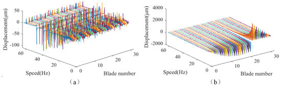 Vibration displacement of all blades. (a) BTT considering speed fluctuation; (b) T-BTT.