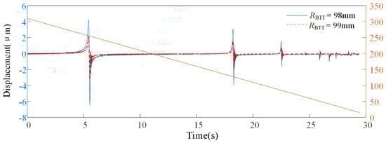The simulation results in Section 4.1.3 are used here without considering the triggering error. In the BTT analysis, the diameter of the blade is set to 99 mm and 98 mm, to simulate the impact on the BTT analysis results when the BTC is reduced by 0.5 mm and 1 mm (the blade is elongated by 1 mm and 2 mm in rotation), respectively. Figure 21 shows the relative error between the vibration displacement calculation results of blade No.1 in the above two cases and the results with the diameter set to 100 mm. Combined with Figure 13, the effect of BTC on the BTT results increases with the deformation of the blade. Therefore, simultaneous monitoring of BTT and BTC is necessary, especially for large rotating machines with larger blade diameters and more intense vibrations, and the influence of BTC on BTT measurements is more pronounced.
