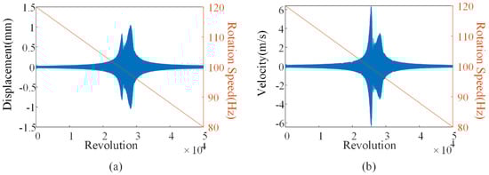 The vibration displacement and vibration velocity of blade No.16, obtained from the simulation, are resampled with sampling frequency of 5000 Hz, and the results are shown in Figure 23. An FFT analysis of vibration displacement and vibration velocity near the two peaks (25,550 th rev to 25,750 th rev and 28,000 th rev to 28,511 th rev) is shown in Figure 24.