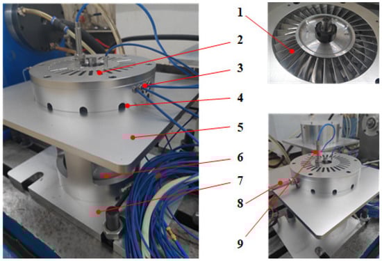 High-speed twist blade test bench. 1. Blade disk. 2. Flow guide portal. 3. BTT sensor. 4. Vents. 5. Operating platform. 6. Support (motor). 7. Base. 8. BTC sensor. 9. Shaft displacement sensor.