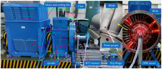 A turbine blade test bench is built to perform some vibration tests on the compressor blades. The main part of the test bench is mainly composed of motor and spindle. A turbine engine full-size integral compressor blisk is mounted on the spindle. The diameter of the blisk is 553 mm. The number of blades is 37. Strain gauges are attached to the blade and a slip ring is mounted on the output shaft end. The fiber optic type of BTT sensor is mounted on the blade protection casing. The OPR probe is at the output shaft end, again with a fiber optic sensor. Figure 27 shows the main part of the test bench. In addition to the parts visible in the diagram, the test system includes the control system, the lubrication system, and the piping. The structure of this experimental bench is relatively complex, capable of complex uncertainty situations, and able to give the reader a deeper understanding of the BTT sampled signals during practical applications.