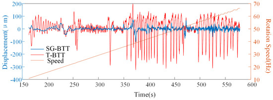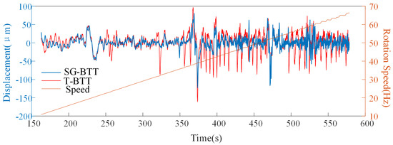 The vibration displacements of all the blades obtained by using the BTT method considering the effect of speed fluctuation and T-BTT processing the ToA of probe No. 1 are shown in Figure 29. There is a significant difference in the vibration displacements obtained by T-BTT in the low-speed region, and this difference is consistent with the simulation results (Figure 18). In contrast, the BTT method considering the effect of rotational speed fluctuation does not have this difference, and the overall trend of vibration displacements of individual blades is consistent.