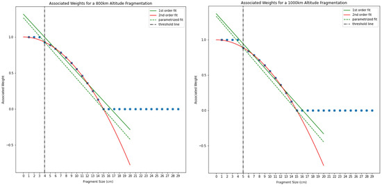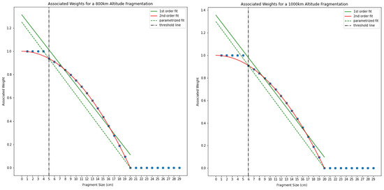 Given the telescope’s elevation and diameter, the risk associated with simulated random fragments of various sizes (values of the function) can be computed. We generated object sizes in the interval 0–30 cm and plotted the results to have a better grasp on the different weights associated with different fragments (note that, unlike the results we will show later in Section 3, the current fragments are not representative of an actual cloud, since they do not follow a specific mass distribution.). Figure 1 shows the results for objects in an 800 km (left) and 1000 km (right) altitude shell. For each plot, there are two size regions for which the associated weight takes either maximum or minimum values. The former represents the non-visible fragments, i.e., those fragments for which , because they do not satisfy Equation (15), while the latter is characterized by those fragments greater or equal to in size. For sizes within an intermediate range, takes values in the interval . These values are well approximated by a second-order polynomial fit (red curve), obtained through a least squares method. A linear least squares fit is also possible, though it typically yields larger residuals. In addition to these two fits, a third linear parametrization could also be constructed directly from known parameters. Specifically, a line can be defined by the two points: