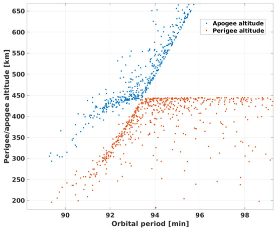 Figure 3 shows the Gabbard Diagram of the 450 km altitude fragmentation. Since km, it is considered that a pure radar network is in place, with all sensors having an elevation angle of 30°. The minimum detectable size, of a fragment at a given altitude can be taken as a proxy for the network’s capabilities. We considered, respectively: cm, 15 cm, 5 cm at 1200 km for radar sensors (these values may represent the capabilities of currently deployed radars used by various entities and companies worldwide for space surveillance and tracking; however, they are simply input parameters, and the developed model allows users to customize this choice to test any specific network).