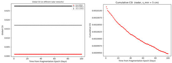 The left panel shows the Global CSI associated with a km fragmentation as a function of time, for different radar networks (top panel). The right panel shows only the cm case to highlight the decreasing trend.