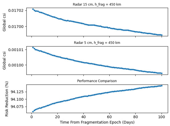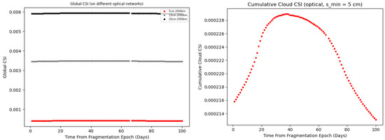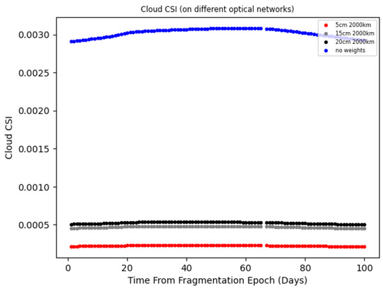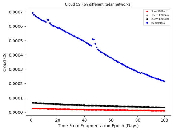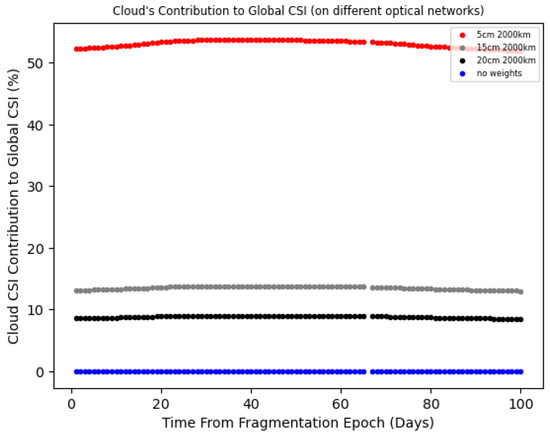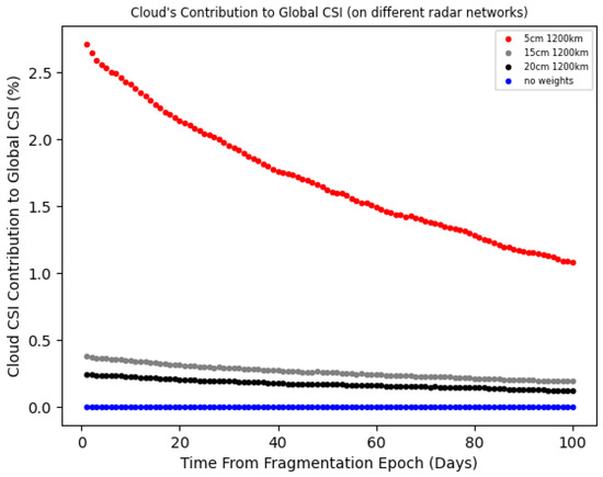 It is also interesting to take a look at the cloud’s contribution to the Global CSI described in the previous subsection. In Figure 6, the cloud contributions for the three different networks are compared. For reference, we also plot (blue dots) the cloud’s CSI values in the scenario where no fragment is detectable (i.e., the blue dots correspond to the case where all fragments have ). From Figure 6, it can be noticed how an improvement in network capability results in a reduction in the Cloud’s CSI value, as one would expect. It is worth noticing also that a more advanced network will be more sensitive to changes in the environment, making a specific cloud more noticeable. This is demonstrated in Figure 7, where we observe an approximately 2.5% contribution of the cloud to the overall LEO criticality in the case of a radar network described by cm, one day after the fragmentation event (to be compared with ∼0.4% at cm and ∼0.3% at cm). To further support this statement, notice how the cloud’s contribution to the Global CSI is nearly zero in the case when (represented by the blue dots); in this scenario, the CSI associated with the background is very high, and the cloud’s contribution becomes almost indistinguishable within it.
