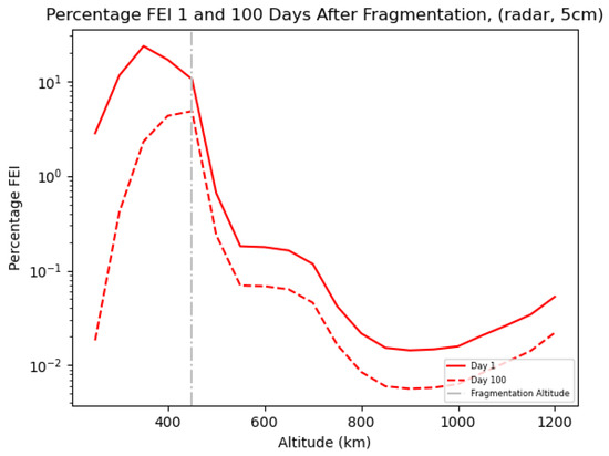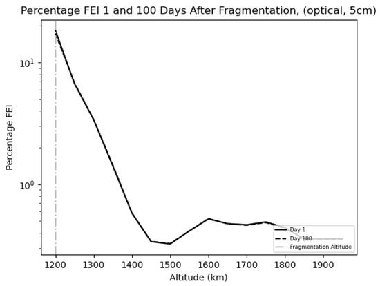 The FEI plots (Figure 14 and Figure 15) once again show the ability of the index to localize the altitude shells that are of most interest in fragmentation (in this case, km). The atmospheric drag effect at high altitudes is not present. For this reason, no relevant change in the FEI is observed at day 100 with respect to day 1. Similar plots were obtained for the fragmentations at km and km. Given that they basically share the same trends and show the same results as the two cases already discussed, it is not deemed necessary to present them here. Our results show how the improved FEI can be used to characterize the effects on the space environment of a fragmentation, leveraged by the performances of a given network of sensors. Additionally, it identifies specific altitude shells that are expected to be particularly affected by the debris cloud in the short term.