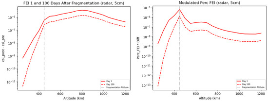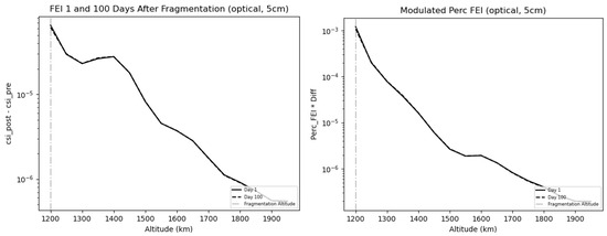 The results of the FEI computation, performed as discussed in Section 2 and Section 2.1, are shown in Figure 8 and Figure 9. Figure 8 displays the percentage FEI given by Equation (4) on the cm network, at 1 (solid line) and 100 days (dotted line) after the fragmentation event, respectively. Although the percentage FEI effectively identifies altitudes experiencing significant stress from fragmentation, it lacks the ability to convey the magnitude of the difference between pre- and post-fragmentation. It is possible for two distinct fragmentations, characterized by different values of and , to result in the same ratio. This similarity arises because the denominator serves as a normalization factor, preventing a clear understanding of the magnitude of the numerator. In order to solve this degeneracy, we also compute the values of as in Equation (3) and plot them in the top panel of Figure 9. In this plot, it is evident that the lowest LEO shells are characterized by a very low FEI, indicating that the difference between the post-fragmentation and pre-fragmentation situations is very small. By multiplying the two functions and , to keep track of the magnitude of the FEI as defined by the differences only, we obtain the Modulated FEI, shown in the right panel of Figure 9, which shows a prominent bump corresponding to the relevant fragmentation altitude. All three images provide an insight into how the FEI evolves over time. A robust environmental index should also effectively capture the overall risk at a specific time, essentially tracking the cloud as it propagates and spreads within the LEO region. Observing the Modulated FEI plot in the right panel of Figure 9, the impact of atmospheric drag, which acts as a sink for all the fragments, is clearly visible.