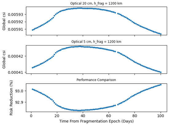 To test the new index formulation, we simulated a collision between a 2000 kg upper stage in a circular orbit of high inclination with = (0.00003, 80.3°) and a 15 kg piece of debris, with a relative velocity of 10 km/s, using the NASA Standard Breakup Model [21] as implemented in the SDM software, Version 4.0 suite [1]. Due to the size and velocity of the projectile, the collision leads to a complete fragmentation of the target. The resulting debris cloud is composed of 41,500 objects with sizes ranging from 0.08 cm to 176 cm. The whole cloud was propagated for up to days. We conducted simulations for four different fragmentation altitudes: km, 800 km, 1200 km, and 1800 km. For the sake of conciseness, we only present and analyze in detail the results obtained for km and km. For our study, we chose to model a network that employs radars to probe the LEO environment up to 1200 km in altitude and telescopes to detect objects at altitudes higher than 1200 km. In accordance with the definition of , this implies setting for our simulations. As mentioned before, this division between radar and optical regimes reflects the current routine of the SST services. Whereas radars demonstrate superior performances compared to telescopes at lower LEO altitudes, optical telescopes offer a cost-effective alternative for higher altitudes, where the use of very powerful (hence expensive) radars would be necessary.