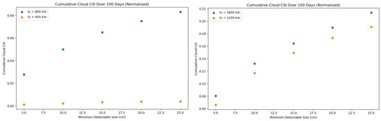 In the same line as performed in [5], by summing up the weighted CSI for all the fragments in a debris cloud, it is possible to obtain a cumulative index, which, once properly normalized, can give a ranking of the danger represented by a given fragmentation leveraged by the observing capabilities of the underlying SST network. The two panels of Figure 16 illustrate the cumulative cloud CSI for fragmentations at altitudes of 450 km and 800 km (left panel, observed by a radar network) and 1200 km and 1800 km (right panel, observed by an optical network). The indices are accumulated over 100 days and normalized to the CSI value in the absence of any network ( for all fragments). For normalization, the reference fragmentation altitude corresponds to the higher altitude in each pair: 800 km for the radar case and 1800 km for the optical case. Note how—for a given fragmentation—the index value increases with both the network’s minimum detectable size, , and the fragmentation altitude, . It is important to note that the normalization factor used here is the cumulative index value in the absence of any network. With this choice, direct comparisons between different fragmentations are not feasible, as the normalization factor depends on the fragmentation itself. However, if the aim is to have a global ranking of fragmentation events for a given network, it is possible to normalize every event relative to a “standard” reference event. This approach would enable the SST system to directly compare different events.