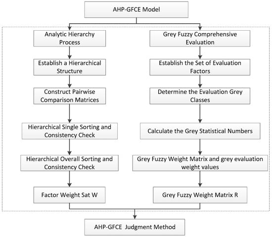 The AHP-GFCE model mainly consists of two parts: the Analytic Hierarchy Process and the Gray Fuzzy Comprehensive Evaluation System [,]. The AHP is used to determine the weights of each evaluation criterion. By constructing a judgment matrix and quantifying the relative importance of each criterion through expert scoring, the weights are calculated. Gray system theory is primarily used to deal with the uncertainty of data and the incompleteness of information. Through gray relational analysis, the degree of correlation between each scheme and the ideal scheme is calculated. The GFCE is carried out on the basis of the AHP. The two complement each other and together enhance the scientific nature, reliability, and effectiveness of the evaluation. The overall evaluation approach is shown in Figure 1.