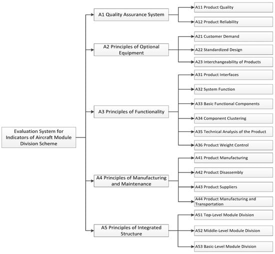 Before determining the weights of the evaluation indicators for the modularization scheme of commercial aircraft, it is necessary to establish a corresponding evaluation indicator system. Through research on commercial aircraft materials [], the modularization of commercial aircraft mainly focuses on five key indicators: product quality reliability, product accessory selection, product functionality, manufacturing and maintenance, and overall product structure composition. These five key indicators can further be divided into eighteen sub-indicators. The evaluation indicator system for the modularization scheme of commercial aircraft is established based on this, as shown in Figure 2.