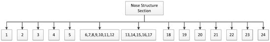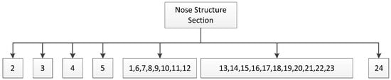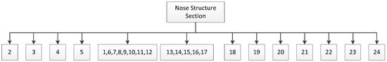 The AHP-GFCE model is applicable to the assessment of module division schemes for different types of commercial aircraft, including regional jets, narrow-body aircraft, and wide-body aircraft. To validate the scientific validity of this evaluation model, this paper selects the nose structure section for module division scheme evaluation. The design and manufacturing of the nose structure have a profound impact on the overall performance of the aircraft. A rational nose structure section design can not only enhance the aircraft’s aerodynamic performance and structural strength but also facilitate equipment installation and maintenance. Additionally, it meets ergonomic requirements and reduces production and operational costs [,]. This paper evaluates the modularization schemes for the nose structure section to seek the optimal division plan. The nose structure section includes the First frame, cockpit components, Hatch Assembly, and so on. The specific components are mainly shown in Table 3.