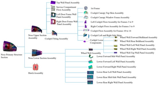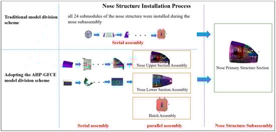 Taking the nose structure section scheme of a certain aircraft type as an example: traditionally, all 24 submodules of the nose structure were installed during the nose subunit assembly phase. The traditional installation process faced issues such as excessive process overlaps, high rework rates, and inefficient resource allocation. Through the implementation of the optimized module division scheme for the nose structure outlined in the aforementioned paper, a modular pre-assembly strategy was adopted. Through the implementation of the optimized module division scheme for the nose structure outlined in the aforementioned paper, a modular pre-assembly strategy was adopted, as shown in Figure 7. The 24 submodules were decomposed into independent modules, such as Hatch Assembly, Nose Upper Section Assembly, and Nose Lower Section Assembly. Leveraging standardized interface designs, independent pre-assembly and parallel operations were achieved. Compared to the traditional process, the overall assembly efficiency of a certain type of aircraft’s nose structure improved by 40%, the total cycle time was reduced by 25%, and the approach better aligned with the engineering and manufacturing requirements of nose structures.