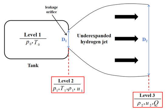 where is pressure; is temperature; is hydrogen density; is flow velocity; subscripts 0 and 1 represent the stagnation state inside the tank and the actual leakage orifice, respectively; is the specific heat ratio of hydrogen; is the molar mass of hydrogen, ; is the gas constant, .