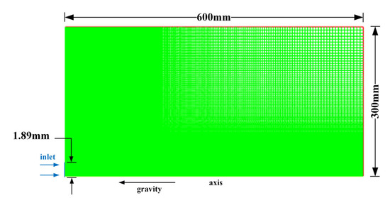 The mesh was refined at the inlet. A structured grid was adopted, and due to the symmetry of the hydrogen jet, a two-dimensional axisymmetric model was adopted to save computational resources and improve computational efficiency, as shown in Figure 2.