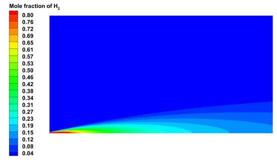 The calculation was performed using a pressure based steady solver with an implicit algorithm. The turbulence model was chosen for the simulation, and the SIMPLE algorithm was used for pressure–velocity coupling. The convection terms were discretized using the second-order upwind scheme. The ambient temperature was set to 300 K, and the pressure outlet was set to one standard atmosphere. The hydrogen leaked vertically, and the effect of gravity was considered, with the gravity acceleration set to 9.8 m/s2 in the direction opposite to the jet. The contour of hydrogen mole fraction was shown in Figure 3 and numerical simulation results were compared with the experimental results, as shown in Figure 4.